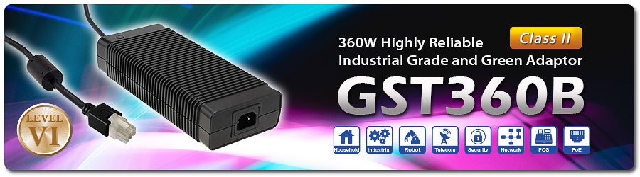 GST360B Series: 360W Class II Highly Reliable Industrial Grade and Green Adaptor (Level VI)