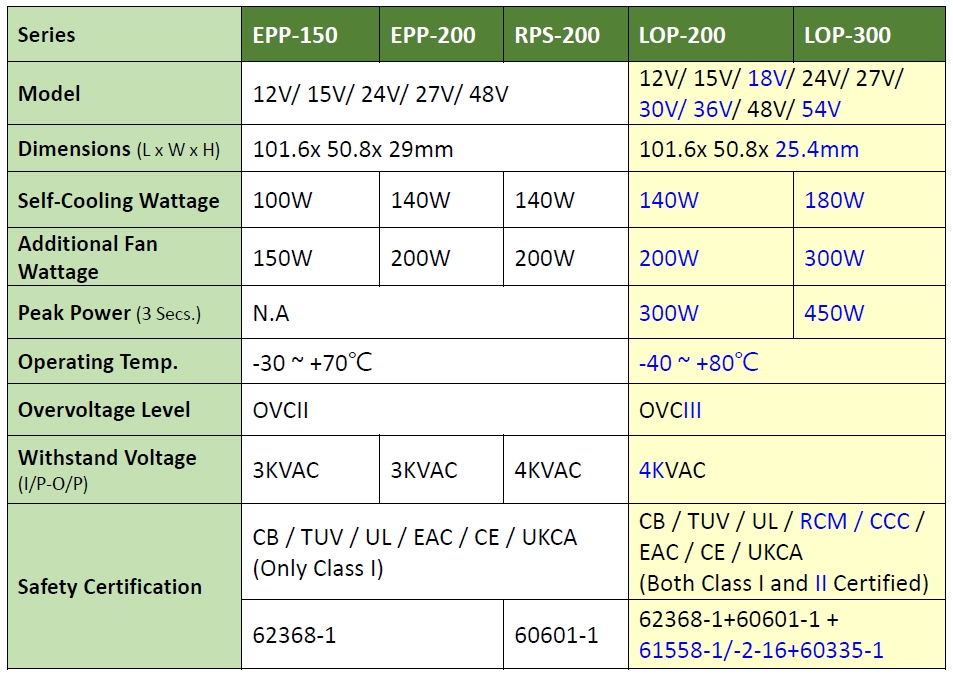 The main differences between LOP-200/300 and the EPP-150/200, RPS-200 models currently available for sale are detailed in the table below. These variances include a thinner profile (1" height), a more comprehensive voltage range of 12-54V, an increased power output up to 300W within a 4" x 2" size, a 150% @3 secs. load capacity, a wider operating temperature range of -40 to +80°C, compliance with OVCIII, and simultaneous adherence to various safety standards such as 62368-1/60601-1/61558-1/60335-1. These certifications make it suitable for a broader range of applications, including telecommunications equipment, medical devices, factory automation, household devices, and more.