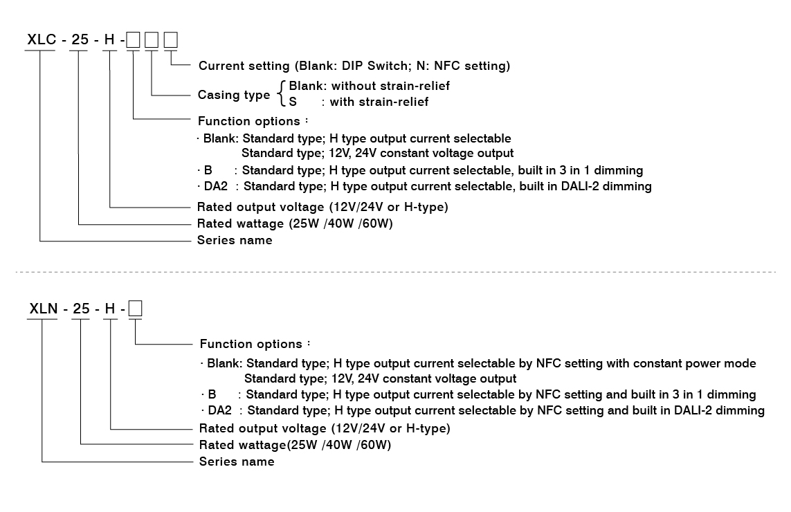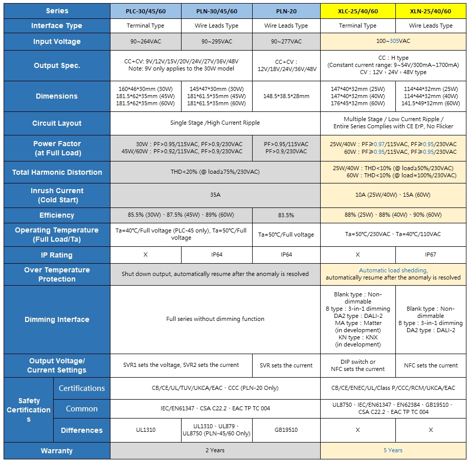 MEAN WELL continues to offer a range of standard LED power supplies, incorporating the latest regulations and output dimming isolation designs. The new compact XLN-25/40/60W series adopts an independent wiring output design, fully encapsulated to meet IP67 waterproof function. The XLC-25/40/60 series features a terminal-block output design, with options for independent or built-in mechanisms. Additionally, multiple current options are available, and the output current can be conveniently adjusted through DIP-Switch or NFC sensing methods. In terms of dimming functionality, various wired or wireless dimming interfaces are also provided, such as 3 in 1 / DALI-2 / KNX / Casambi / Matter (IoT), etc. The minimum brightness can be adjusted to 0.1%, making it convenient for customers to integrate with different smart control solutions. Various dimming products will also be launched successively in the future.