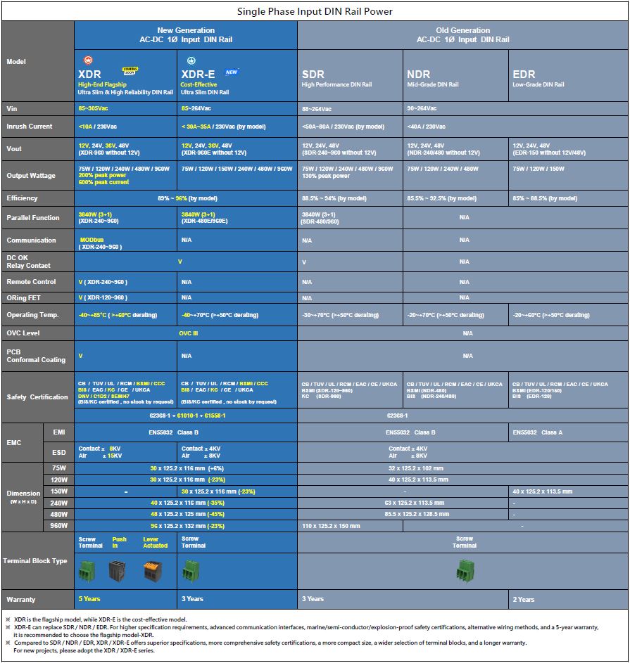 The XDR-E series stands out for its exceptional balance of performance and value! Compared to the previous SDR/NDR/EDR series, the XDR-E features a significantly reduced size—23% to 45% smaller (depending on the model). It also offers a more complete product lineup, addressing the market gap for 240W/480W 12V models while expanding the entire series to include 36V options. With improved efficiency of up to 96%, a wider operating temperature range of -40 to +70℃, and compliance with more international regulations across various industries, the XDR-E series delivers superior performance at a more competitive price - helping to reduce overall system costs.